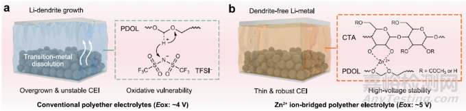 聚醚電解質因其優良的鋰鹽解離能力和對鋰金屬負極的高穩定性而備受關注,尤其是在固態和準固態電池領域。然而,由于醚氧官能團在高電壓下的不穩定性,聚醚電解質的氧化電位通常較低(4.2 V),這使得聚醚電解質難以與三元正極和高壓鈷酸鋰正極匹配,從而限制了其在高比能電池中的應用潛力。為此,研究團隊提出了一種聚醚電解質離子橋聯的新策略,通過鋅離子與醚氧之間的配位作用來穩定醚氧的孤對電子,從而實現了氧化電位超過5 V的聚醚電解質。