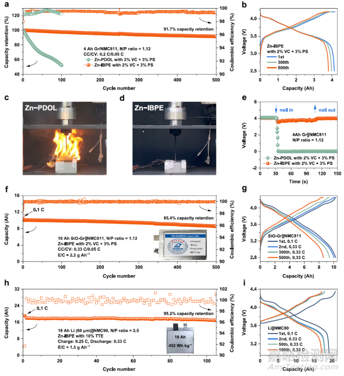 最后,結合電解質添加劑工程,使用安時級別軟包電池驗證了離子橋聯聚合物電解質的應用潛力。在使用離子橋聯電解質的4 Ah石墨||NMC811軟包循環500周后,其容量保持率高達91.7%,同時通過針刺測試,表現出良好的安全性。此外,在高比能鋰離子電池和鋰金屬電池中,離子橋聯電解質也展示出優異的性能。使用該電解質的10 Ah硅碳||NMC811軟包,循環500周后容量保持率達到85.4%;將該電解質應用于18Ah鋰金屬||NMC90軟包電池中,其在C/3電流下其能量密度超過450 Wh/kg,百周期循環容量保持率大于95%。綜上所述,離子橋聯電解質及策略表現出極大的應用潛力。