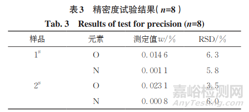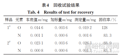 氧、氮的空白值主要是由助熔劑、石墨坩堝、載氣等引起的。按照試驗方法對鎳籃-鎳囊連續測定11次,質量輸入為1.0000g,計算氧、氮的空白值及標準偏差s,以3倍和10倍的標準偏差計算檢出限(3s)和測定下限(10s)。結果表明,氧、氮的檢出限為0.0005%,0.00005%,測定下限為0.0015%,0.00016%。