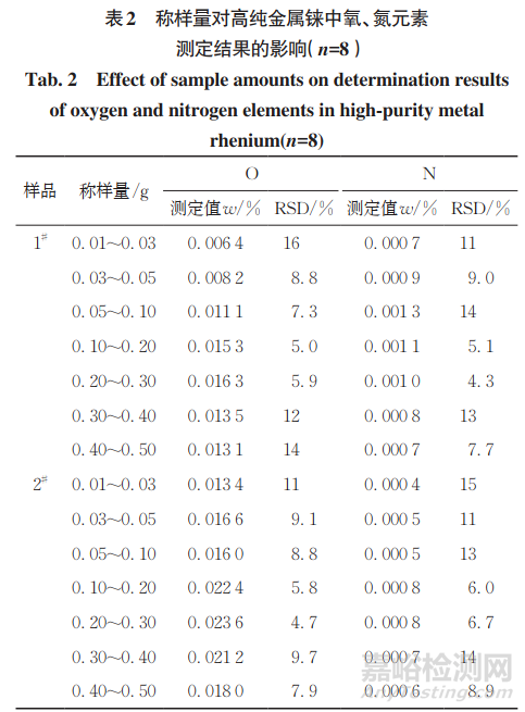 稱樣量是影響測定結果的重要因素之一,稱樣量過小不具備代表性,稱樣量過大會影響樣品的熔融效果。試驗以高純金屬錸樣品1#、2#為研究對象,考察了不同稱樣量(0.01~0.03g,0.03~0.05g,0.05~0.10g,0.10~0.20g,0.20~0.30g,0.30~0.40g,0.40~0. 50g)對樣品中氧、氮元素測定結果的影響,每個樣品平行制備 8份,計算測定值的RSD,結果見表2。