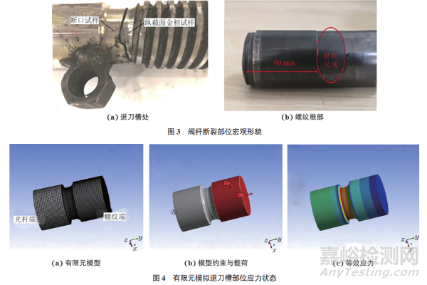 閥桿斷裂位置基本都在退刀槽、螺紋根部等變徑部位(見圖3),閥桿變徑處的結構形式一方面造成應力高度集中,另一方面縮小了承載面積,是閥桿整體最薄弱的部位。張學星等對閥桿退刀槽部位的應力狀態進行了有限元模擬分析。首先將螺紋部分簡化為直桿,并且在中間變徑區域細化網格[見圖4(a)];然后在底部施加固定約束,在上部施加200N·m的扭矩和500N的拉力[ 見圖4(b)];最終通過等效應力云圖[ 見圖4(c)]發現在變徑處存在應力集中,且整個退刀槽部位的受力和兩端相比較大,是造成閥桿斷裂的危險區域。