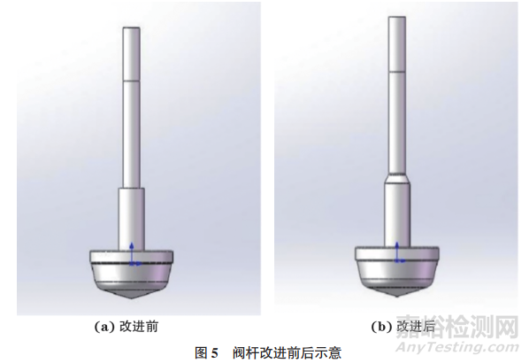 因此,最好在閥桿的變徑部位設置圓滑過渡,以緩解應力集中造成的潛在危害(見圖5)。廖煜輝對改進前后的閥桿10% 開度下的應力狀態進行模擬(見圖6),改進優化前閥桿變徑直角階梯處等效應力分布極不均勻,有局部出現應力過高的狀況,其中最大值為4.3167MPa;優化后的等效應力分布比較均勻,等效應力為3.3458MPa,改善效果明顯。