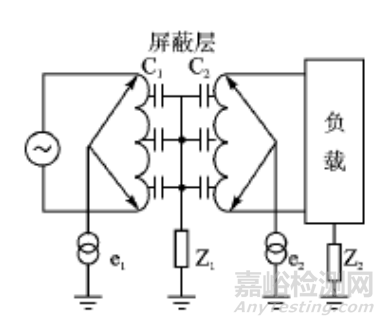 共模干擾作為一種顯著的干擾形式,其傳播主要依賴于變壓器繞組間的耦合電容。通過(guò)在變壓器的初級(jí)與次級(jí)之間引入屏蔽層并確保其有效接地,干擾電壓得以通過(guò)屏蔽層進(jìn)行旁路,進(jìn)而降低輸出端的干擾電壓水平。該屏蔽層對(duì)變壓器的能量傳輸特性無(wú)負(fù)面影響,然而,它會(huì)對(duì)繞組間的耦合電容產(chǎn)生作用。圖2展示了帶有屏蔽層的隔離變壓器中共模干擾的傳播路徑。圖中,C1代表初級(jí)繞組與屏蔽層之間的分布電容,C2代表次級(jí)繞組與屏蔽層之間的分布電容,Z1為屏蔽層接地阻抗,Z2為負(fù)載對(duì)地阻抗,e1為初級(jí)干擾(共模)電壓,e2為次級(jí)干擾(共模)電壓。