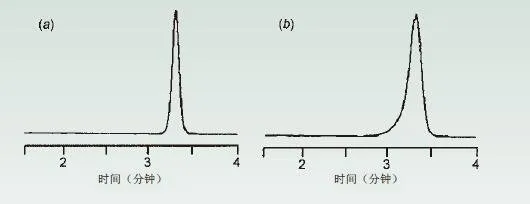 更換色譜柱不能解決此問題,所以篩板堵塞并非導(dǎo)致這一現(xiàn)象的原因。如果減少色譜柱上樣品,如圖3(b),峰形看起來更像是兩個(gè)峰,而不是一個(gè)肩形峰。