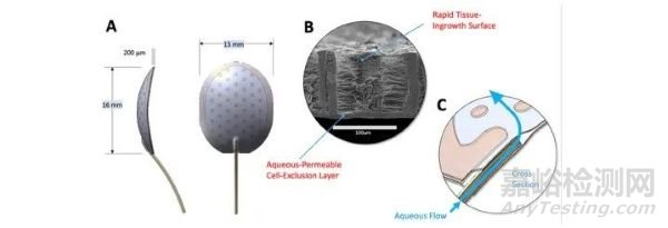 GORE GDI是一種100毫米厚的裝置,由一個雙層膨脹聚四氟乙烯(ePTFE)材料口袋與插入前房的硅膠管連接而成。ePTFE是GORE的專利材料,已用于其他生物醫學設備,包括血管移植物和疝膜。其目的是促進植入術后的生理組織整合,比目前青光眼引流植入術形成的纖維囊更薄、密度更低,滲透性更強,潛在地改善水滲透性和持續降低眼壓。