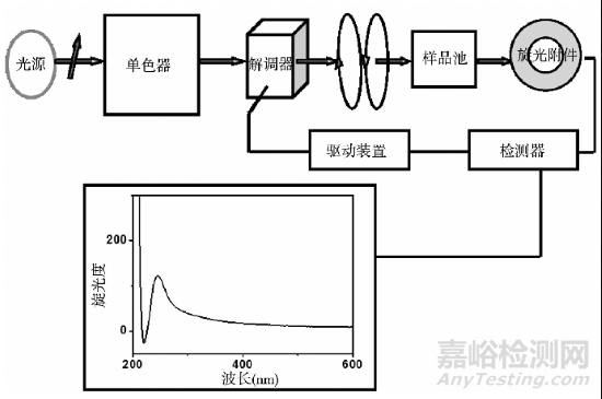 圓二色光譜儀主要由氙燈、單色器、光電調節器、樣品池以及光電倍增管檢測器組成,其結構簡示圖如圖 5 所示。