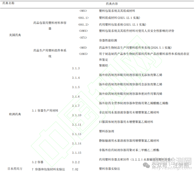 《美國藥典》目前<661>包含聚乙烯、聚丙烯、聚對苯二甲酸乙二醇酯容器,以及熱分析、生物測試、理化測試方法等內(nèi)容。2025 年 12 月 1 日正式生效的<661.1>和<661.2>涉及塑料材料和塑料包裝系統(tǒng),且材料部分會增加環(huán)烯烴聚合物、聚酰胺等材質(zhì)[3];《歐洲藥典》塑料標(biāo)準(zhǔn)收入了較為詳細(xì)的塑料材料部分(包含材料鑒別和水溶出物、可提取元素、添加劑檢查等)和容器部分[4];《日本藥局方》有塑料容器實(shí)驗(yàn)法和通用信息內(nèi)容(藥用塑料容器和輸液容器用橡膠密封件的基本要求)[5]。相較于國外藥典,2020 年版《中國藥典》藥包材標(biāo)準(zhǔn)中,除部分方法標(biāo)準(zhǔn)外,沒有塑料類藥包材相關(guān)標(biāo)準(zhǔn)。