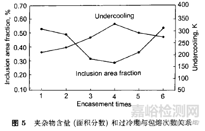 圖5示出過冷度及夾雜物含量與包熔次數的關系從圖可見,隨包熔次數增加,夾雜物含量減少,純凈度增大,過冷度相應增大。包熔4次以后,夾雜物增多,鋼液中異質形核核心增加,純凈度降低,過冷度也開始降低,表明鋼液純凈度提高能增加鋼液的過冷度,在凈化過程中過冷度無法進一步提高的原因是熔融玻璃的凈化能力達到飽和,同時被玻璃吸附的雜質大部分擴散到了金屬與玻璃的界面上,它們有可能依舊作為異質有效核心,導致異質形核,影響大過冷度的獲得,另外,玻璃中的固有雜質也可能作為異質有效核心,使過冷度無法提高。