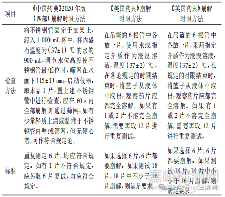 ▲表2-國內外藥典崩解試驗分析方法及限度要求