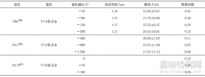 基底偏壓是PVD技術中對涂層結構及性能影響最大的參數之一,可以直接控制涂層生長過程中的吸附原子遷移率。表1列舉了近年來關于不同基底偏壓下磁控濺射涂層的耐磨性能研究。由表1可知:摩擦學性能對基底偏壓非常敏感,隨著基底偏壓增大,摩擦因數先減小后增大,這是因為隨著基底偏壓增大,吸附原子遷移率增大,對柱狀晶的生長起到了抑制作用,使得涂層結構轉為細晶結構,致密性提高,表面粗糙度減小;負偏壓過高時,離子轟擊作用過強會使涂層產生夾雜物、裂紋等缺陷,削弱耐磨性。