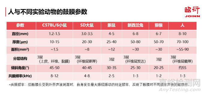 人及不同實(shí)驗(yàn)動(dòng)物耳部鼓膜結(jié)構(gòu)組成大致一致,但不同實(shí)驗(yàn)動(dòng)物鼓膜面積不同,在某些參數(shù)上如厚度、傾斜角度上也存在差異,在選擇實(shí)驗(yàn)動(dòng)物進(jìn)行研究時(shí)需要關(guān)注。