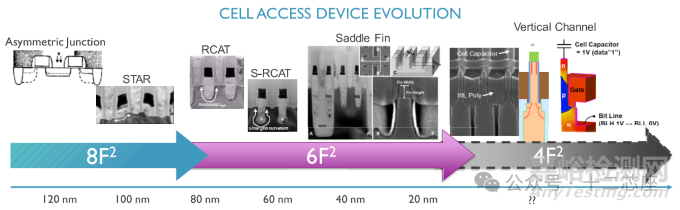 自130納米及以下制程起,6F² BCAT結構登場,單元布局優化為位線3格、字線2格,大幅提升單元密度。然而,隨線路寬度縮小到10納米級,物理極限致電流泄漏、信號干擾頻發,平面棋盤格排列單元難以為繼。