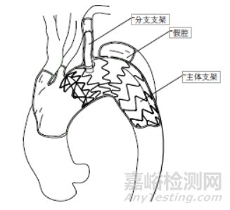3.2主動(dòng)脈弓分支支架系統(tǒng)主動(dòng)脈弓分支支架系統(tǒng)用于主動(dòng)脈分支血管的血運(yùn)重建,必須與主動(dòng)脈弓主體支架系統(tǒng)聯(lián)合使用。主動(dòng)脈弓分支支架與主動(dòng)脈弓主體支架配合使用的方式為原位開窗技術(shù),手術(shù)中需使用我司的破膜系統(tǒng)對(duì)主動(dòng)脈弓主體支架施行體內(nèi)原位開窗,如圖1所示,植入分支支架實(shí)現(xiàn)左鎖骨下動(dòng)脈血運(yùn)重建。