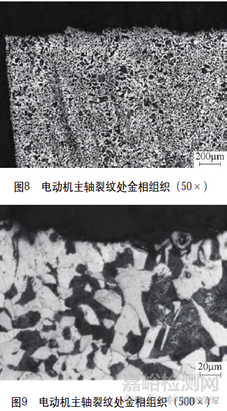 (3)微觀組織檢測(cè)樣品001~003段低倍組織檢測(cè)結(jié)果見(jiàn)表4;電動(dòng)機(jī)主軸非金屬夾雜物微觀形貌如圖7所示,其檢測(cè)結(jié)果見(jiàn)表5。電動(dòng)機(jī)主軸裂紋處金相組織如圖8、圖9所示;電動(dòng)機(jī)主軸心部A、B端金相組織分別如圖10、圖11所示。