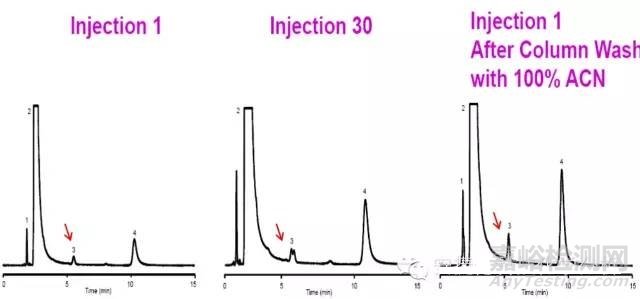 在開始時沒問題,在使用一段時間后出現(xiàn)這個問題,可能是由于污染引起的。這時需要對色譜柱加強沖洗,即使用比方法流動相更強的溶劑沖洗色譜柱。圖1中使用純乙腈沖洗色譜柱消除了3號峰分叉問題。