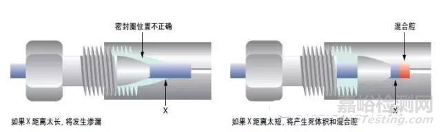 管線可能太長或太短——這種情況可能導致滲漏或峰分叉/拖尾,如圖2所示。如果管線太長,密封圈位置不當,將發(fā)生滲漏。如果管線推出的距離不夠,將會產(chǎn)生一段死空間,形成混合腔,導致柱外體積,使峰形變壞。如果您使用的是不同廠商的色譜柱,一定要確保使用正確的接頭,并保證色譜柱末端接頭位置正確。