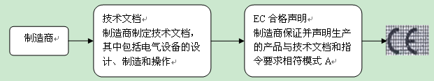 低電壓指令采用模式A,即制造商的自我聲明的合格評定方式。由制造商自己對產品進行評價,如果符合法規要求,制造商簽發符合性聲明,直接在產品上使用CE標志。政府不參與評定過程,只負責產品投放市場后的監督。具體見以下流程圖:
